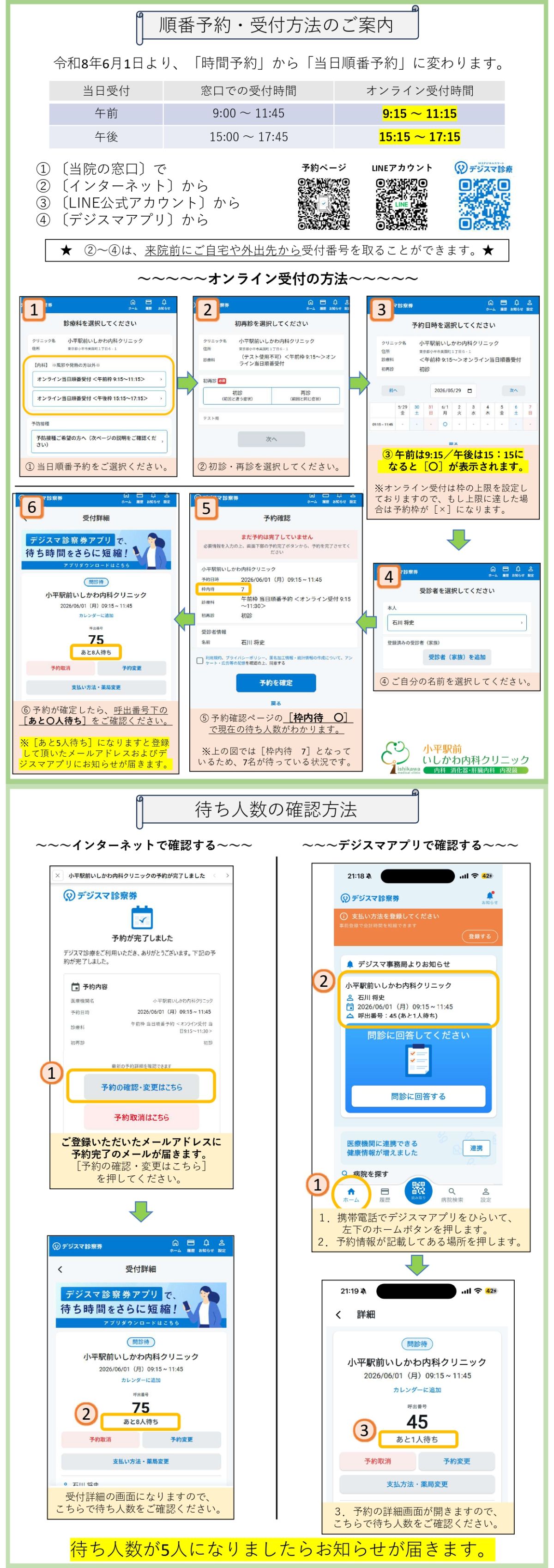 日頃より当院をご利用いただき、誠にありがとうございます。 当院では2024年12月の開院以来、「事前予約優先制」にて診療を行ってまいりました。しかしながら、現在多くの患者様にご来院いただいており、**「予約が取りづらい」「予約時間通りに診察が始まらない」「予約が取れなかった場合非常に長い待ち時間となる」**といった状況が続き、ご不便をおかけしております。